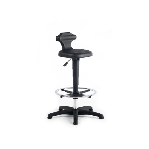 INTERSTUHL sitte-og-stå-stol. Med et svart sete og lav rygg av polyuretan gir den solid støtte. Stolen har en krombelagt fotring og justerbar setehøyde som rommer opptil 120 kg. Med en polyamid base, TÜV Rheinland-sertifisering og 10 års garanti. Setehøyde: 510-780mm Setebredde: 360mm Setedybde: 300mm Rygghøyde: 200mm Vipp: Nei Justerbar mottrykk: Nei Korsryggstøtte: Ja Justerbar korsryggstøtte: Nei Nakkestøtte: Nei Justerbar nakkestøtte: - Armlene: Nei Justerbare armlener: - Maksimal garantert vektkapasitet: 120kg Maks anbefalt brukstid: - Materiale: Polyamid stolbase, sete og rygg av polyuretanskum Totale dimensjoner (HxBxD): 980x360x300mm Farge: Sort Garanti: 10 år