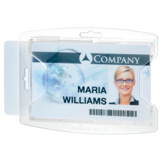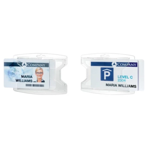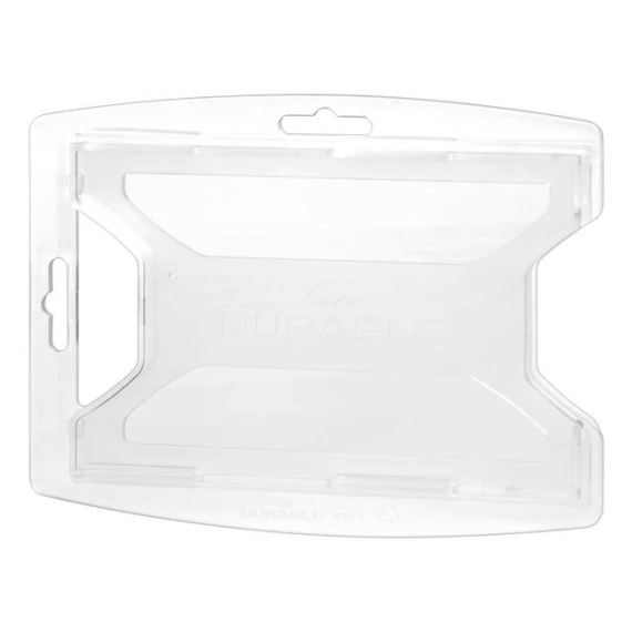 Beskytter to kort i en slitesterk holder. Robust kortholder med plass til to kort, laget av slitesterk polypropylen. Tommelgrep gir enkel tilgang til kortene. Brukes med tekstilhalsbånd, jojo eller stroppklemme, og kan stilles både stående og liggende. Passer kort i standardstørrelse 54x85 mm. - Holder to kort - Tommelgrep for enkel tilgang - Kompatibel med tilbehør