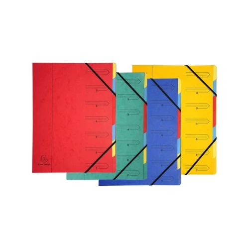 Exacompta sorteringsmappe. Exacompta sorteringsmappe ekte premium pressboarddeksel 355 g/m2, Fargede kortdeler 170 g/m2. Elastiske stropper og stiftet rygg. Trykt omslag for å hjelpe med å identifisere innholdet. 24,5x32 cm for A4. 7 seksjoner. - Ekte premium pressboarddeksel. - Fargede kortdeler. - Elastiske stropper og stiftet rygg.