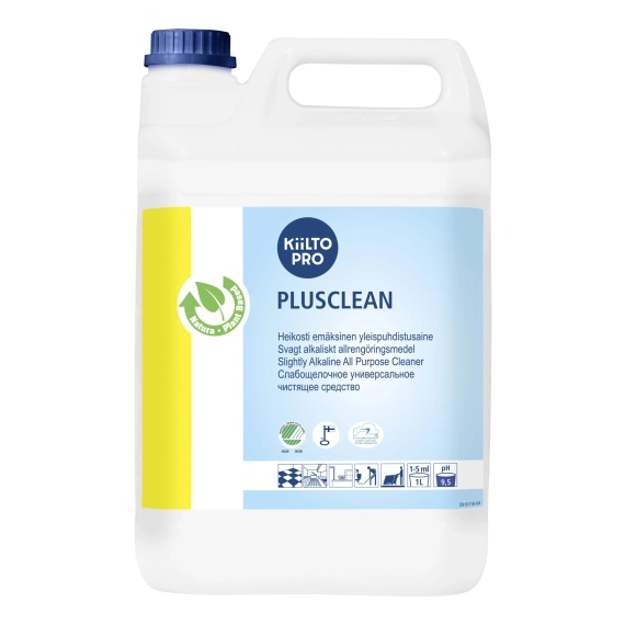 Kiilto Plusclean for manuell og maskinell vedlikeholdsrengjøring av harde overflater. Egnet til å rengjøre kjøkken og sanitærfasiliteter. - Sertifisering: Svanemerket - Parfymefri - Dosering 1-5 ml per 1 l vann - pH: 9,5