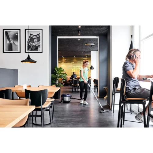 Nilfisk VP930 Pro Hepa Blue er utviklet for profesjonell rengjøring med maksimal effektivitet og minimal forstyrrelse. Med et lydnivå helt nede på 50dB(A) er den perfekt for rengjøring både dag og natt, i kontorlandskap, hoteller og offentlige bygg. Den kraftige sugeevnen kombinert med et ekstra stort HEPA 13-filter og 15 liters støvpose gir førsteklasses ytelse og filtrering. Praktiske løsninger som avtakbar ledning og oppgradert kabeloppbevaring sørger for enkel betjening og reduserte vedlikeholdskostnader. Velg en støvsuger som jobber stille og leverer stort. - Stille og effektiv støvsuger - Lydnivå (IEC/EN 60335-2-69): 50 dB(A) - Spenning/frekvens: 220-240/50-60 V/Hz - Nominell effekt: 760W - Sugeeffekt v/ munnstykke: 285W - Luftmengde: 37l/sek. - Vakuum ved munnstykke: 26 kPa - Lydtrykknivå IEC/EN 60335-2-69: 55 dB(A) - Kabellengde: 15m - Støvsugerpose kapasitet: 15l - Hovedfilter type: HEPA 13 - Hovedfilter areal: 12000cm² - Dimensjoner (LxBxH): 45x39x33cm - Vekt: 7kg