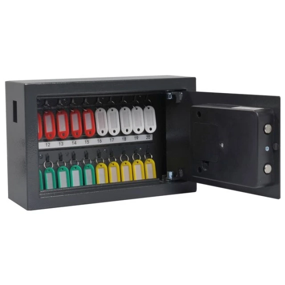 Organiser og sikre nøklene dine med PAVO nøkkelskap for opptil 20 nøkler. PAVO nøkkelskap er en praktisk og sikker løsning for oppbevaring av opptil 20 nøkler. Skapet er laget av robust metall og har nummererte kroker for enkel nøkkelidentifikasjon. Med en elektronisk lås sørger det for sikker oppbevaring av nøklene dine. Perfekt for både kontor og hjem! - Kapasitet: 20 nøkler - Elektronisk lås for ekstra sikkerhet - Slitesterk stålkonstruksjon - Mål: 205x147x347mm - Farge: Mørkegrå