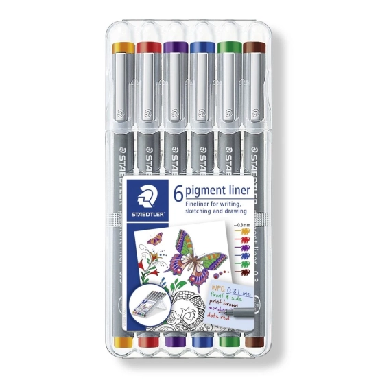 STAEDTLER® Pigment fineliner. Smart STAEDTLER eske laget av plast med 6 blyanter i 6 farger. Fineliner for tegning, skriving og skissering. Lang metallspiss, ideell for bruk med linjaler og maler. Pigmentfarge, arkivbestandig (i henhold til ISO 14145-2), blekes ikke, vannavstøtende. Utviskbar når den brukes på matt tegnefilm, blør ikke igjennom ved overstryking. Linjebredde 0,3 mm.