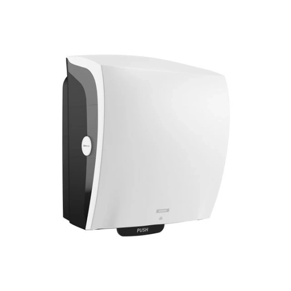 Håndtørkeløsning hvor plane ark mates ut ett om gangen for kontrollert forbruk, der besøkende kun berører papiret som skal brukes. Dispenseren styres av en sensor som aktiveres automatisk når den besøkende holder hendene i nærheten av dispenseren. Det er mulig å stille inn størrelsen på aktiveringsområdet i tre ulike moduser for å tilpasse ulike behov. Drives av batterier, men hvis batteriene går tomme, kan den brukes til å mate papir manuelt, noe som betyr at dispenseren fortsatt fungerer mens den venter på batteribytte. Drives av 4 LR20 1,5V batterier (ikke inkludert). Ikke bruk oppladbare batterier. - To alternative papirmatingsalternativer: automatisk utmating eller 'skjult' der utmating skjer ved bevegelse av hånden under dispenser - Det er mulig å stille inn papirlengden i tre forskjellige posisjoner S, M og L - Med innstilling S kan du få ut opptil 800 ark, slik at papiret er tilgjengelig også på steder med høy besøksfrekvens - Effektiv papirutnyttelse, designet for å maksimere papirbruken på hver rull - Materiale: Laget av ABS (Akrylonitril Butadien Styrene) og PC (Polykarbonat) som tåler bruk i krevende miljøer - Hele dispenseren kan resirkuleres - Farge: Hvit