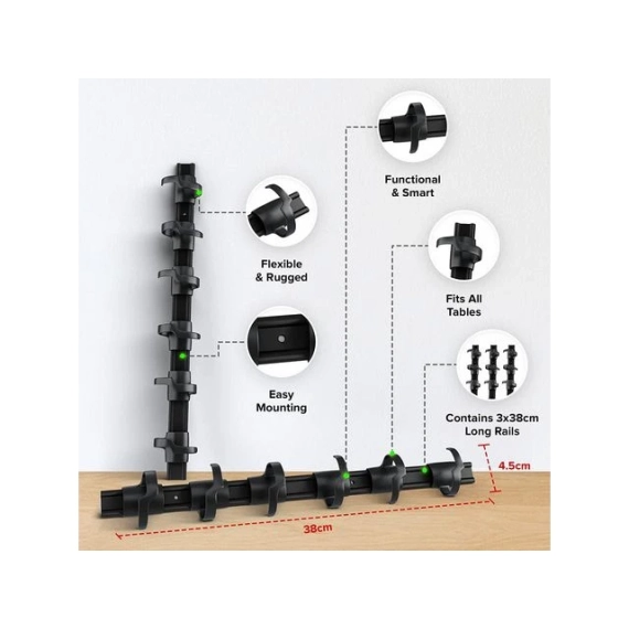 Kabelopphenget passer til alle bord. Med kabeloppheng kan du selv velge hvor du ønsker å montere de 3 skinnene under bordet. Dette gjør at du får en ryddig fordeling mellom kablene, og enhetene kablene kommer i fra under skrivebordet.