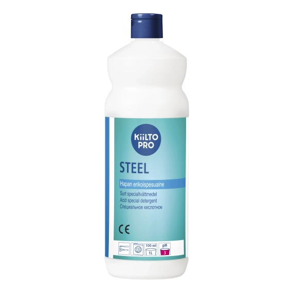 Kiilto Steel er surt rengjøringsmiddel for instrumentdekontaminatorer og instrumenter i rustfritt stål. Fjerner kalkbelegg, rustflekker og oksidfilmer i helsetjenesten - Kan også brukes i nedsenkningsbad og ultralydvaskemaskiner Bruksløsning pH: 3