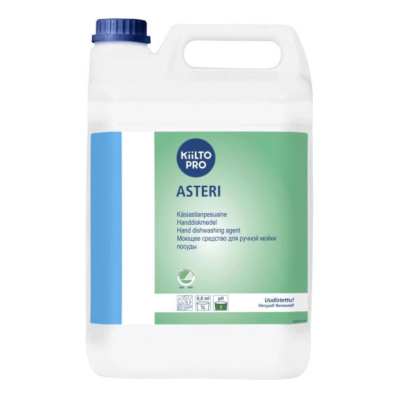 Kiilto Asteri for manuell oppvask og overflaterengjøring av redskaper. Også egnet til å rengjøre vinduer. Inneholder glyserol for å bevare hudens fuktighet. - Luktfri og uten farge-stoffer - Sertifisering: Svanemerket - Løsningens pH: ca. 7