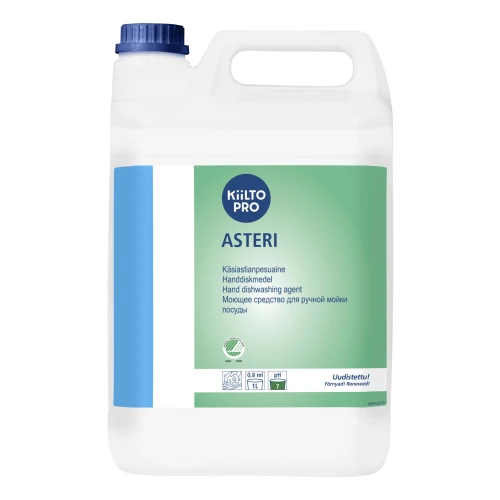 Kiilto Asteri for manuell oppvask og overflaterengjøring av redskaper. Også egnet til å rengjøre vinduer. Inneholder glyserol for å bevare hudens fuktighet. - Luktfri og uten farge-stoffer - Sertifisering: Svanemerket - Løsningens pH: ca. 7