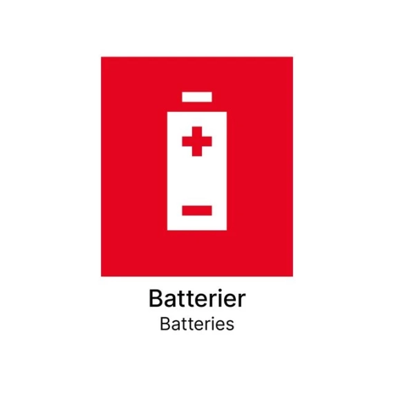Kildesorteringsetikett Batteri i format 148x210mm med norsk og engelsk tekst. Etikett i PVC materiale med screentrykk og permanent lim. Kan brukes på innendørs og utendørs avfallsbeholdere.