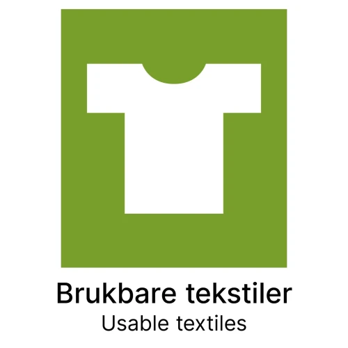 Kildesorteringsetikett i format 148x210mm med norsk og engelsk tekst. Etikett i PVC materiale med screentrykk og permanent lim. Kan brukes på innendørs og utendørs avfallsbeholdere. Etikett i PVC materiale med screentrykk og permanent lim. Kan brukes på innendørs og utendørs avfallsbeholdere. - Etikkett for kildesordering brukbar tekstil - Format: A5 - Materiale: PVC