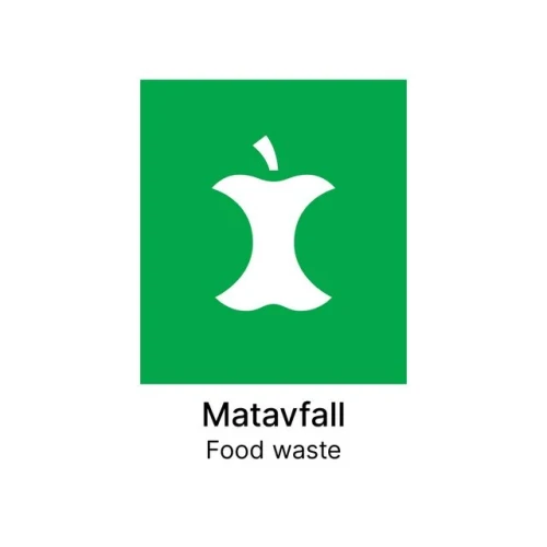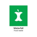 Kildesorteringsetikett Matavfall i format 148x210mm med norsk og engelsk tekst. Etikett i PVC materiale med screentrykk og permanent lim. Kan brukes på innendørs og utendørs avfallsbeholdere.