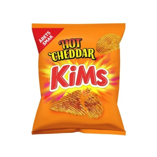 KiMs Hot Cheddar er ekstra sprø potetchips med masse smak av sterk cheddarost. Kims Hot Cheddar er et krydret og riflet potetgull. Et perfekt følge til godt drikke. Chipsen er produsert på chipsfabrikken på Skreia, av nøye utvalgte poteter. Den tomme posen kan resirkuleres, kildesorteres som plastavfall. - Krydret potetchips - Allergener: Melk