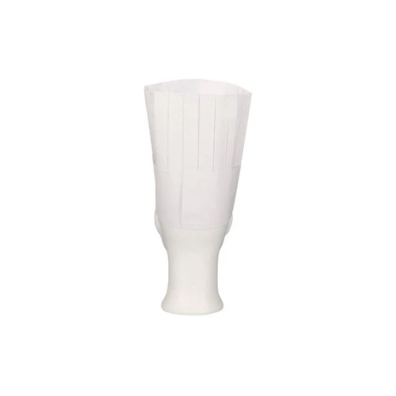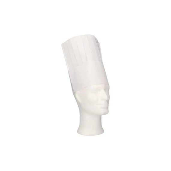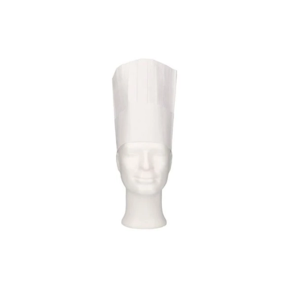 Klassisk kokkehatt med krone og svettebånd, høy variant. - Materiale: papir - Størrelse: universell størrelse - Farge: hvit - Høyde: 20 cm - Bruksområde: kjøkken, restauranter og catering.