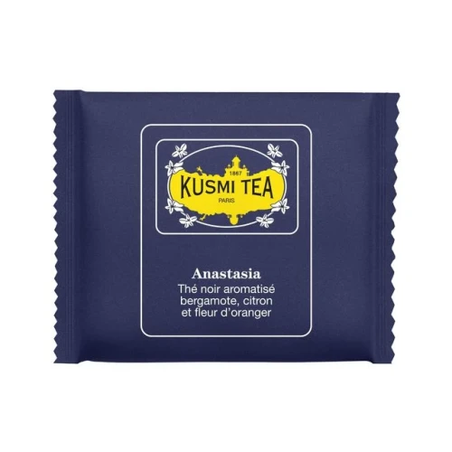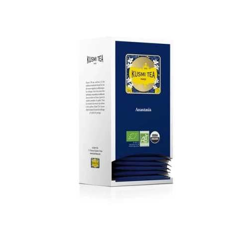 Økologisk te fra Kusmi Tea, kjent for sine aromatiske teblandinger. Anastasia er en av de mest kjente variantene fra Kusmi te, en ekstra smakfull variant av Earl Grey. Sort te med bergamot, sitron og appelsinblomst. I over 150 år har Kusmi Tea dyrket både tradisjon og modernitet, samtidig som de har skapt originale og ikoniske oppskrifter. Te-blandingene er resultatet av fagkunnskap, og produseres og pakkes i Frankrike ved bruk av de fineste råvarene. Rikdommen i blandingene er hentet fra mangfoldet i naturen, og Kusmi Tea bruker naturlige smaker og økologiske teer i oppskriftene. Ideell vanntemperatur ved tilbereding er 90°C og teen bør trekke 3-5 minutter. - Sort te med bergamot, sitron og appelsinblomst - Individuelt innpakkede teposer