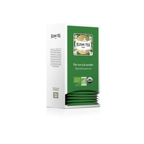 Økologisk grønn te fra Kusmi, kjent for sine aromatiske teblandinger. Grønn mynte-te er både forfriskende og beroligende. I over 150 år har Kusmi Tea dyrket både tradisjon og modernitet, samtidig som de har skapt originale og ikoniske oppskrifter. Te-blandingene er resultatet av fagkunnskap, og produseres og pakkes i Frankrike ved bruk av de fineste råvarene. Rikdommen i blandingene er hentet fra mangfoldet i naturen, og Kusmi Tea bruker naturlige smaker og økologiske teer i oppskriftene. Ideell vanntemperatur ved tilbereding er 75°C og teen bør trekke 3-4 minutter. - Grønn te med spearmint - Individuelt innpakkede teposer
