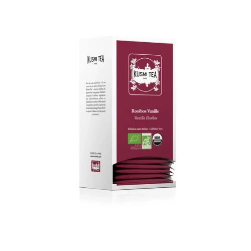 Økologisk rooibos-te fra Kusmi Tea, kjent for sine aromatiske teblandinger. Den runde smaken av rooibos sammen med søt vanilje gir en herlig, varmende kopp te. Koffeinfri, nytes når som helst på dagen. I over 150 år har Kusmi Tea dyrket både tradisjon og modernitet, samtidig som de har skapt originale og ikoniske oppskrifter. Te-blandingene er resultatet av fagkunnskap, og produseres og pakkes i Frankrike ved bruk av de fineste råvarene. Rikdommen i blandingene er hentet fra mangfoldet i naturen, og Kusmi Tea bruker naturlige smaker og økologiske teer i oppskriftene. Ideell vanntemperatur ved tilbereding er 90°C, la teen trekke i 5 minutter. - Urtete med vaniljesmak - Koffeinfri - Individuelt innpakkede teposer