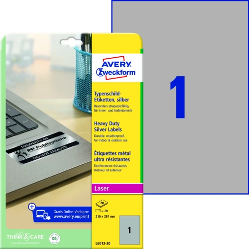 Avery stærke etiketter er vandfaste og modstandsdygtige over for olie, smuds og UV stråler og er desuden velegnet til udendørs brug. Polyester etiketter er specielt velegnet til brug i miljøer, som stiller høje krav til etikettens holdbarhed. Velegnet til mærkning af PC-udstyr, kontormøbler, værktøj og produkter - eller som stilfuld mærkning af brochurer, mapper og hylder m.m.. Sølvfarvede stærke etiketter har en anvendelsestemperatur fra -20°C til +80°C (kan anvendes i fryser). Indeholder 20 ark - 20 etiketter pr. pakke. Anvendelse: F.eks. udendørs brug eller i fryseren Farve: Sølv Antal etiketter pr. ark: 1 Størrelse: 210 x 297 mm Printer: Laser