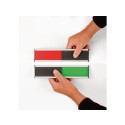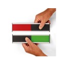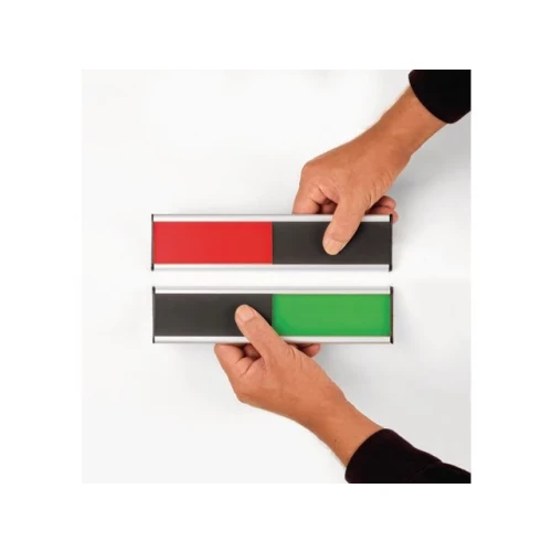 Dørskilt Legamaster® som forteller om lokalet er ledig eller opptatt. Dette internasjonalt anerkjente dørskiltet har en avrundet aluminiumsramme med et svart skyvesystem for enkel justering. Rammen, laget av aluminium, inneholder et polystyrenpanel, og plastikkbraketter brukes som endestykker. Skiltet måler 6 cm i høyden og 25 cm i bredde. Det er laget av aluminium og monteres ved hjelp av dobbeltsidig tape. - Det er mulig å påføre tekst i de fargede feltene (etiketter følger ikke med, men se mulighetene under etikettmaskiner). - Mål (HxBxD): 6,1x25,7x1,7cm