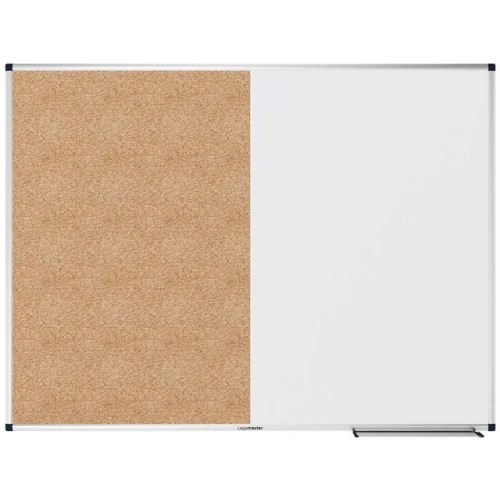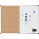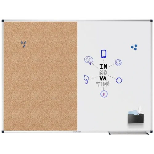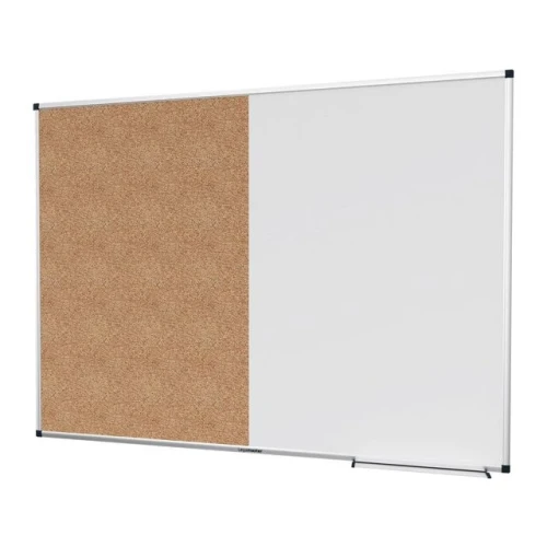 Funksjonell tavle og oppslagstavle for sporadisk bruk på kontoret eller hjemmekontoret. Plassbesparende dobbelfunksjonstavle for skriving og festing. Kombitavle 90x120cm Lett å feste notater, skisser og bilder med magneter og tegnestifter Enkel skjult veggmontering Den ene halvdelen: Magnetisk lakkert ståltavleoverflate som egner seg til å skrive på med whiteboardtusjer Den andre halvdelen: Pinboard med naturlig korkplateoverflate Aluminiumsramme med grå plasthjørnekapper (Pantone 433C) Kan monteres horisontalt eller vertikalt Markeringsbrett (30 cm) med endestykker, monteringssett og monteringsanvisning følger med