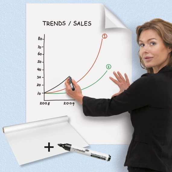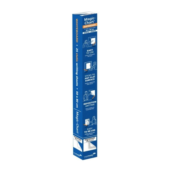 Legamaster Magic-Chart Whiteboard er et hvitt elektrostatisk skriveark som du kan bruke til å presentere ideer i enhver situasjon. Magic Chart krever ikke festemiddel for å feste seg til overflater, og etterlater ingen merker. Det elektrostatiske foliematerialet klistrer seg enkelt til nesten hvilken som helst overflate (tre, betong, glass, tapet), noe som betyr at du kan presentere dine planer eller ideer der det er nødvendig. - Foliemateriale kleber seg til de fleste overflater - Kan skrives på med en hvilken som helst markør - Arkene er gjenbrukbare når de brukes med Legamaster-tusjer - Mulig å legge til presentasjonskort på tavlen uten lim - Fullt resirkulerbare tavleark - Innhold: 25 magiske tavleark + 1 Legamaster TZ 100-tusj - Tavlearkdimensjoner: 600 x 800 mm