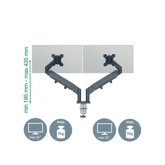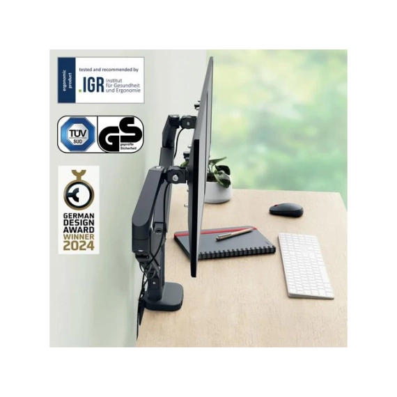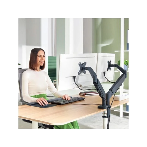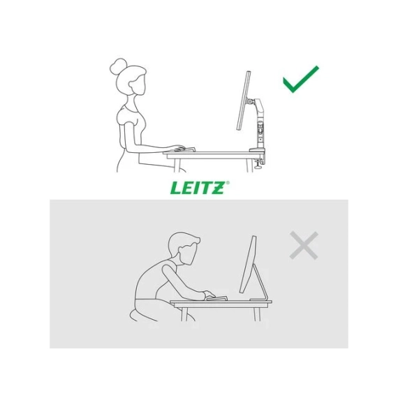 Leitz plassbesparende skjermarm har en positiv innvirkning på kroppsholdningen, fremmer riktig øyejustering og støtter nakke- og skulderkomfort når høyden på skjermene er justert riktig, og som anbefalt, til den ideelle ergonomiske posisjonen. Skjermene forblir stabile i alle høyder og vinkler og kan enkelt byttes mellom liggende og portrettmodus. Dens design er ideell der det er begrenset plass, og det vil frigjøre verdifull plass på skrivebordet. - Ergonomisk utformet for å fremme velvære og øke produktiviteten. Leitz plassbesparende skjermarm har en positiv innvirkning på kroppsholdningen, fremmer riktig øyejustering og støtter nakke- og skulderkomfort når høyden på skjermene er justert riktig, og som anbefalt, til den ideelle ergonomiske posisjonen - Plassbesparende design gjør at den kan monteres også der det er lite plass, uten at det går på bekostning av dybdeskarphet og optimal visuell ergonomi - Skjermene kan justeres helt uavhengig av hverandre, og de kortere støttearmene lar skjermer i forskjellige størrelser sømløst justeres - Fjærassistert dobbel skjermarm for enkelt å justere skjermenes høyde (185 mm-435 mm) - Har 180° svingning og skjermrotasjon, +90°/- 90° tilt og tillater justering opp, ned, forover og bakover - Støtter 13'-34' flat eller buede skjermer som veier opp til 9 kg per. stk. - Enkel å installere med den medfølgende hurtigutløsende avtakbare Vesa®-platen (75 og 100 mm) og silikongummi c-klemme som reduserer vibrasjoner og beskytter skrivebordoverflaten eller ved hjelp av hull (bordtykkelsesområde: 10-80 mm). Verktøy for montering og justeringer inkludert - Kabeladministrasjonssystem holder skjermkabler organisert for et ryddigere arbeidsområde IGR og TÜV sertifisert.