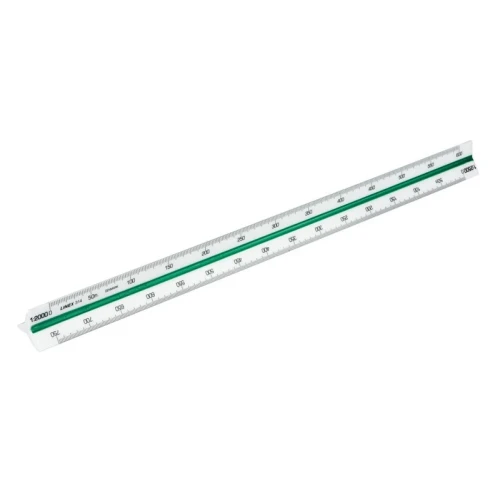 Med seks forskjellige skalaer. Presisjonsinndelt. Notater i to farger. Materiale: Matt, hvit dunirit. Inndeling 1:500:1000:1250:1500:2000:2500.