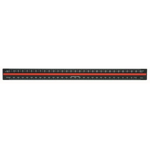 Målestokk i svartfarget aluminium. Skalaer i tre farger. Lengde: 300 mm. Inndeling: 1:1:2:5:20:50:100:200:500:1000:1250:2500.
