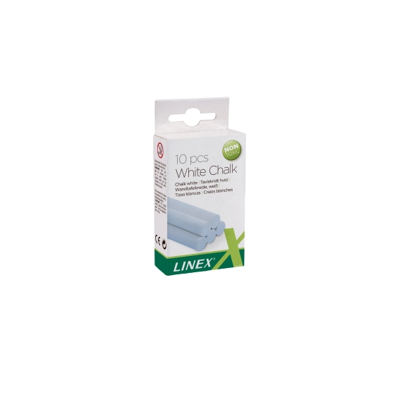 Runde, støvfrie hvite kritt av beste kvalitet. Produsert i kalsiumkarbonat – myke og behagelige å skrive med og viskes enkelt ut. 10 stk. i eske med hull til oppheng