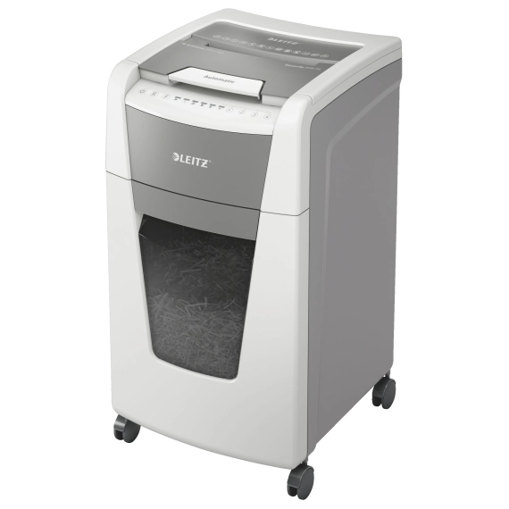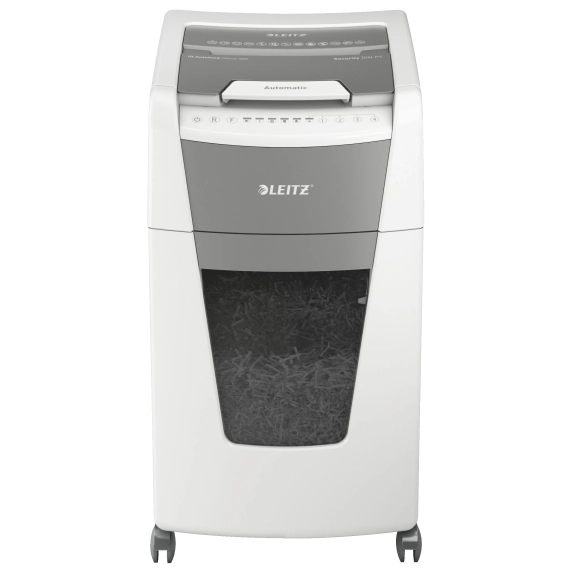 Helautomatisk makuleringsmaskin fra Leitz med unik, ren tømming av beholderen. Så intelligent at den fungerer stille på egen hånd, bare legg i bunken med papirer (inkl. stifter og binders), lukk lokket og fortsett med andre oppgaver. Ideell for bruk på kontoret. Konfidensiell sikkerhet og utmerket ytelse med denne stille makuleringsmaskinen med autofeed mating, anti-jam funksjon og 60 min driftstid. Makuler automatisk 300 ark A4 med P4 (4x28 mm) sikkerhetsgrad i en vending. Romslig 60 liter beholder. Enkel betjening ved hjelp av berøringskontroller. - Automatisk mating av opptil 300 A4 ark. Manuell mating av opptil 10 ark (80g) - Unik tømming uten papirrester. Knivene reverserer etter bruk og forhindrer at papirrester faller bak beholdene når den trekkes ut - Infrarød sensor for full beholder og varsel når beholderen er 80% full for å unngå rot - Meget stillegående - Anti jam teknologi for makulering uten stans. Stopper automatisk og reverserer papirene hvis man mater inn for ma