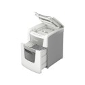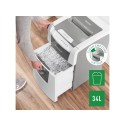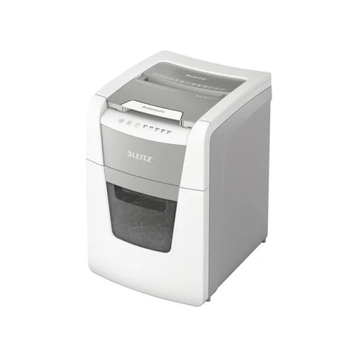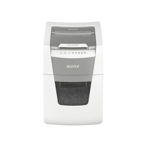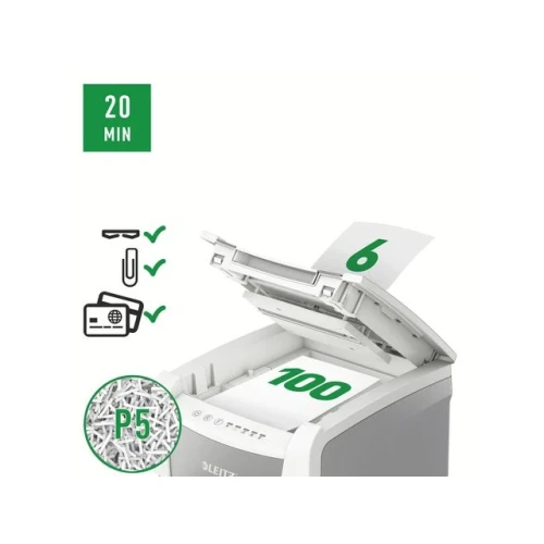 Makuleringsmaskin, Leitz® IQ AutoFeed Small Office 100 P5 helautomatisk makuleringsmaskin med unik ren tømming av beholderen. Bare legg i bunken med papirer (inkl. stifter og binders) lukk lokket og fortsett med andre oppgaver. Makuler automatisk 100 ark A4 med P5 (2x15 mm) sikkerhetsgrad. - Romslig 34 liter beholder - Enkel betjening ved hjelp av berøringskontroller - Automatisk mating av opptil 100 A4 ark. Manuell mating av opptil 6 ark (80g) - Unik tømming uten papirrester. Knivene reverserer etter bruk og forhindrer at papirrester faller bak beholdene når den trekkes ut - Infrarød sensor for full beholder og varsel når beholderen er 80% full for å unngå rot - Meget stillegående - Anti jam teknologi for makulering uten stans. Stopper automatisk og reverserer papirene hvis man mater inn for mange ark - Kontinuerlig 20 minutter driftstid gjør at man kan makulere hele papirkammeret i en vending. ECO stand by modus aktiveres etter 3 minutter uten bruk - Sikkerhetsgrad P5 mikrokutt (2x15mm) - Romslig 34 liters beholder som trekkes ut for å tømmes. Hele kammeret kan makuleres før beholderen må tømmes - Touch kontroll gir enkel og intuitiv betjening - Makulerer kredittkort stifter og binders