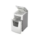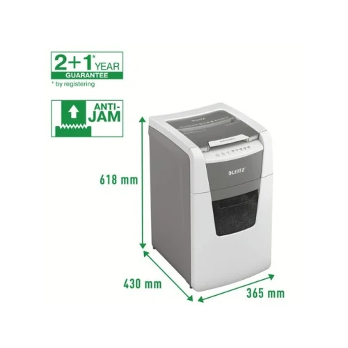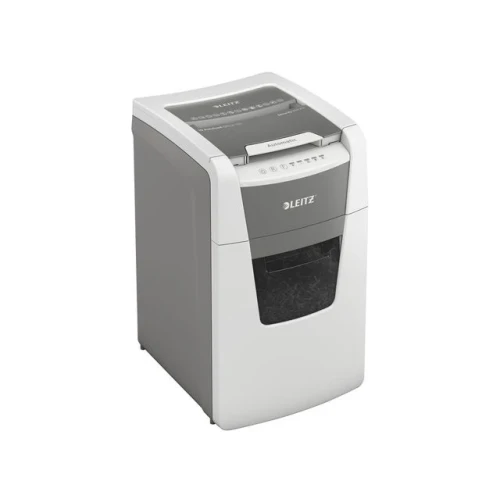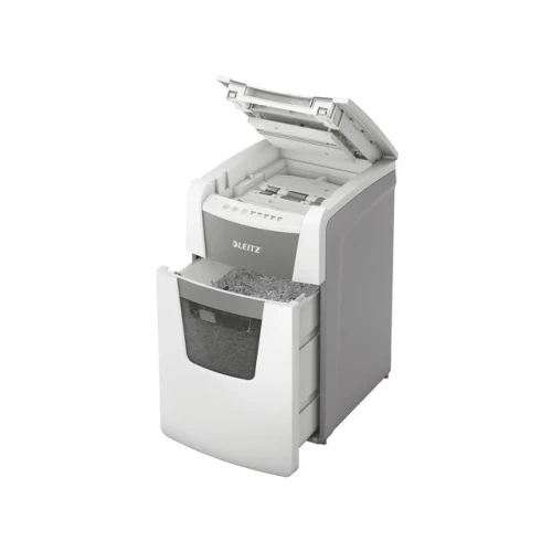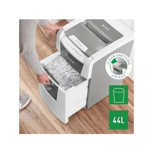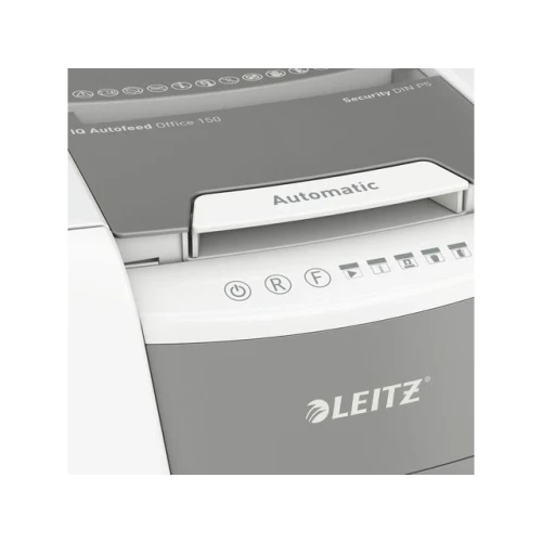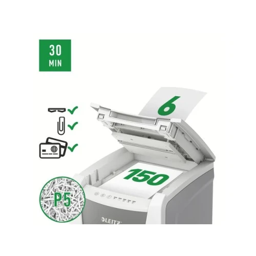 Makuleringsmaskin, Leitz® IQ AutoFeed Office 150 P5 helautomatisk makuleringsmaskin med unik, ren tømming av beholderen. Legg i bunken med papirer (inkl. stifter og binders), lukk lokket og fortsett med andre oppgaver. Konfidensiell sikkerhet og utmerket ytelse med denne stille makuleringsmaskinen med autofeed mating, anti-jam funksjon og 30 min driftstid. - Makuler automatisk 150 ark A4 med P5 (2x15 mm) sikkerhetsgrad i en vending - Automatisk mating av opptil 150 A4 ark. Manuell mating av opptil 6 ark (80g) - Unik tømming uten papirrester. Knivene reverserer etter bruk og forhindrer at papirrester faller bak beholdene når den trekkes ut - Infrarød sensor for full beholder og varsel når beholderen er 80% full for å unngå rot - Meget stillegående - Anti jam teknologi for makulering uten stans. Stopper automatisk og reverserer papirene hvis man mater inn for mange ark - Kontinuerlig 30 minutter driftstid gjør at man kan makulere hele papirkammeret i en vending. ECO stand by modus aktiveres etter 3 minutter uten bruk - Sikkerhetsgrad P5 mikrokutt (2x15mm) - Romslig 44 liters beholder som trekkes ut for å tømmes. Hele kammeret kan makuleres før beholderen må tømmes - Touch kontroll gir enkel og intuitiv betjening - Makulerer kredittkort, stifter og binders