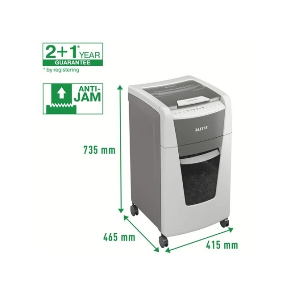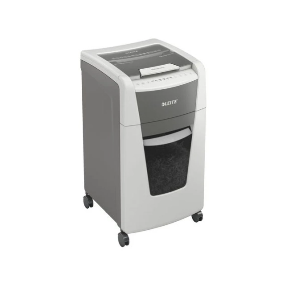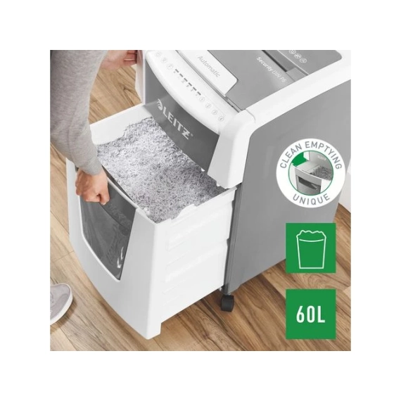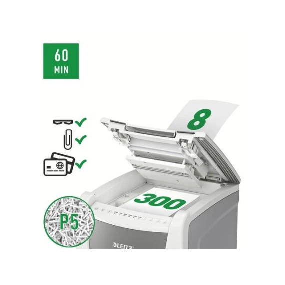 Makuleringsmaskin, Leitz® IQ AutoFeed Office 300 P5 helautomatisk makuleringsmaskin med unik, ren tømming av beholderen. Ideell for bruk på kontoret. Makuler automatisk 300 ark A4 med P5 (2x15 mm) sikkerhetsgrad i en vending. - Romslig 60 liter beholder. Enkel betjening ved hjelp av berøringskontroller - Automatisk mating av opptil 300 A4 ark. Manuell mating av opptil 8 ark (80g) - Unik tømming uten papirrester. Knivene reverserer etter bruk og forhindrer at papirrester faller bak beholdene når den trekkes ut - Infrarød sensor for full beholder og varsel når beholderen er 80% full for å unngå rot - Meget stillegående - Anti jam teknologi for makulering uten stans. Stopper automatisk og reverserer papirene hvis man mater inn for mange ark - Kontinuerlig 60 minutter driftstid gjør at man kan makulere hele papirkammeret i en vending. ECO stand by modus aktiveres etter 3 minutter uten bruk - Sikkerhetsgrad P5 mikrokutt (2x15mm) - Romslig 60 liters beholder som trekkes ut for å tømmes. Hele kammeret kan makuleres før beholderen må tømmes - Touch kontroll gir enkel og intuitiv betjening. Pin kode for låsing av matekammeret - Makulerer kredittkort, stifter og binders. Fire hjul gjør det enkelt å flytte på maskinen