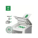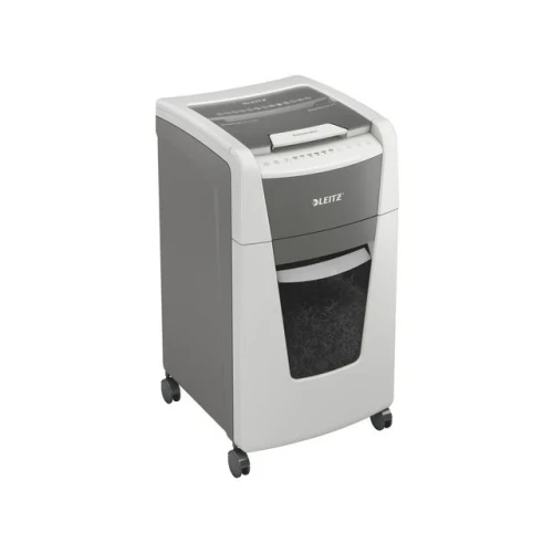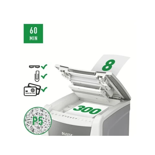 Makuleringsmaskin, Leitz® IQ AutoFeed Office 300 P5 helautomatisk makuleringsmaskin med unik, ren tømming av beholderen. Ideell for bruk på kontoret. Makuler automatisk 300 ark A4 med P5 (2x15 mm) sikkerhetsgrad i en vending. - Romslig 60 liter beholder. Enkel betjening ved hjelp av berøringskontroller - Automatisk mating av opptil 300 A4 ark. Manuell mating av opptil 8 ark (80g) - Unik tømming uten papirrester. Knivene reverserer etter bruk og forhindrer at papirrester faller bak beholdene når den trekkes ut - Infrarød sensor for full beholder og varsel når beholderen er 80% full for å unngå rot - Meget stillegående - Anti jam teknologi for makulering uten stans. Stopper automatisk og reverserer papirene hvis man mater inn for mange ark - Kontinuerlig 60 minutter driftstid gjør at man kan makulere hele papirkammeret i en vending. ECO stand by modus aktiveres etter 3 minutter uten bruk - Sikkerhetsgrad P5 mikrokutt (2x15mm) - Romslig 60 liters beholder som trekkes ut for å tømmes. Hele kammeret kan makuleres før beholderen må tømmes - Touch kontroll gir enkel og intuitiv betjening. Pin kode for låsing av matekammeret - Makulerer kredittkort, stifter og binders. Fire hjul gjør det enkelt å flytte på maskinen