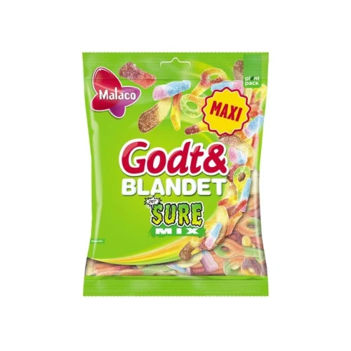 Godt & Blandet Sure er garantert sur blanding, med bred variasjon av biter. En blanding for deg som virkelig elsker ekstra surt godteri. - Cola, Sure smukker, Sure fruktbiter og Sure brusflasker - Vekt: 325 gram