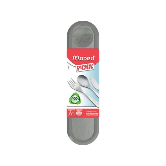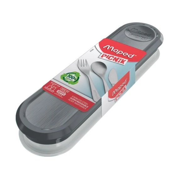 Kompakt bestikksett i en hendig boks til å ta med, for måltider på farten. Bestikk til å ta med! Liten og lett boks som inneholder kniv, gaffel og teskje - får enkelt plass i sekk eller veske. Maped bestikksett passer til alle anledninger når du er på farten, enten det er på jobb eller skole, på tur i skogen eller lunsj i parken. Bestikket er laget av rustfritt stål, og både bestikk og boks tåler maskinoppvask. - Kniv, gaffel og teskje i praktisk boks - Materiale bestikk: Rustfritt stål - Kan vaskes i oppvaskmaskin - Mål (LxBxH): 16,7x4,4x2,4cm