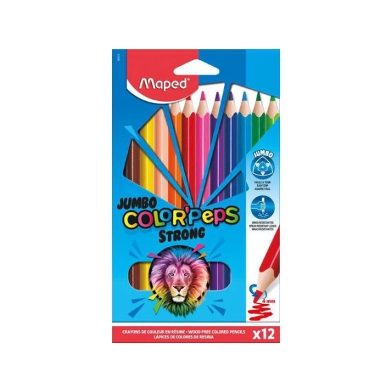 Maped fargeblyant Jumbo Strong med lettere grep for små barn. Myk og motstandsdyktig fargeblyanter. - Ø: 4 mm - Pakke med 12 assorterte farger