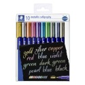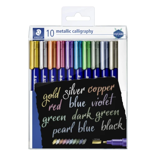 Staedtler® 8325 SET Metallic calligraphy - transparent box, 10 ass. For opaque writing and decorating on light and dark paper as well as on card. Ideal for scrapbooking and greeting cards. No pumping or shaking required. Can be easily wiped off smooth surfaces like glass and mirrors using a damp cloth. Line width approx. 2.8 mm. Wallet containing 10 metallic calligraphy in 10 assorted colours