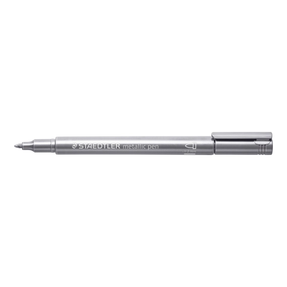STAEDTLER® 8323 Metallic marker silver. For opaque writing and decorating on light and dark paper as well as on card. Ideal for scrapbooking and greeting cards. No pumping or shaking required. Can be easily wiped off smooth surfaces like glass and mirrors using a damp cloth. Line width approx. 1-2 mm. Metallic marker pen with fibre-tip