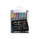 Marker STAEDTLER metallic er ideell for utklippsbok, tegne, dekorere eller lage bord eller gratulasjonskort. Kan brukes på mørkt og hvitt papir eller papp. - Trenger ikke pump eller riste - Kan enkelt tørke av overflater som glass, vinduer og speil - Linjebredde 1-6 mm - Innhold: 10 marker metallic