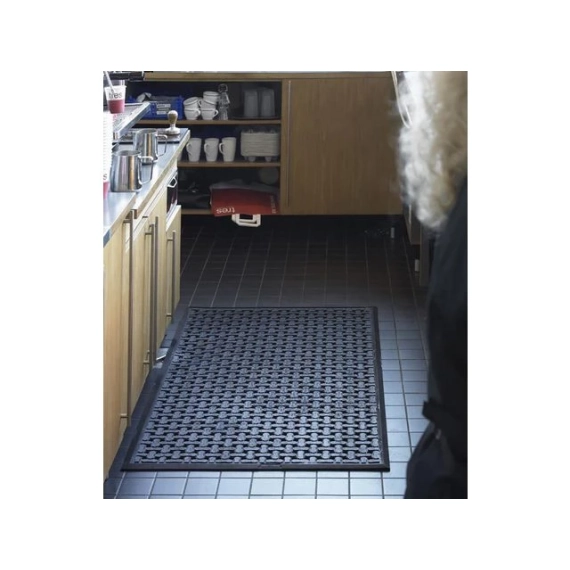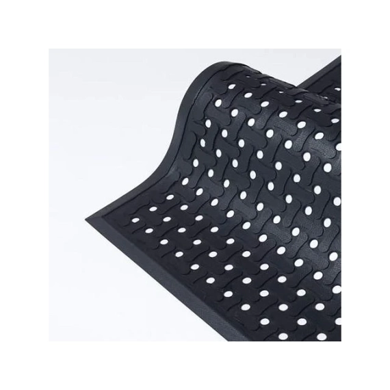 Comfort Flow er en veldig myk og fleksibel arbeidsplassmatte som gir god komfort på harde gulv. Det kraftige mønsteret gjør den sklisikker og den åpne konstruksjonen slipper gjennom og drenerer ut fukt og ventilerer gulvet. Antistatiske matter / ESD-matter er designet for raskt å spre statisk elektrisitet fra mennesker, noe som reduserer risikoen for at utstyr som er følsomt for statisk elektrisitet blir skadet. - Den er laget av 100 % nitrilgummi, noe som gjør den meget motstandsdyktig mot oljer, fett, kjemikalier og skjærevæsker - Antimikrobielt behandlet for å redusere - bakterievekst, noe som gjør den egnet selv i miljøer med høye krav til hygiene, som restaurantkjøkken - En ekstra sterk, skrå kant som reduserer risikoen for å snuble - Statisk dissipativ, i henhold til klasse 2 - Materiale: Nitrilgummi, antimikrobielt behandlet - Tykkelse: 12 mm - Oljebestandighet: Lang eksponering - Temperaturområde: -35 ° C - + 120 ° C - Brannkarakter: D.O.C. -FF-1-70 (Pilletest) - Pleie: Skyll eller maskinvask, kan desinfiseres med antiseptiske kjemikalier. Tåler autoklav
