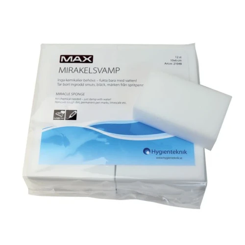 Her trengs ingen kjemikalier, kun tilsett vann til svampen, klem ut og knikk svampen lett over til flekken er borte. Effektiv selv på ujevne overflater. Anbefales å teste produktet på et lite område først da produktet har en lett slipende effekt. Mål (LxB): 10 x 6 cm