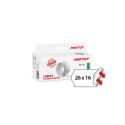 Passer til alle vanlige tolinjers håndholdte prispistoler med etikettstørrelse 26 x 16 mm. Med universalmål og UTC (universal transport cut) som sikrer stabil mating. Kompatibel med METO Classic, Arrow, Eagle, Flash, ProLine prispistoler samt prispistoler fra Avery, Contact, Blitz, Tovel, Open, Sato, Etimark, Samark, Jolly, Herlitz, Prix osv. Permanent, kan ikke fjernes uten å gå i stykker. Høy repetisjonshastighet og effektiv merking.