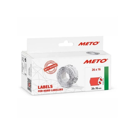 Passer til alle vanlige tolinjers håndholdte prispistoler med etikettstørrelse 26 x 16 mm. Med universalmål og UTC (universal transport cut) som sikrer stabil mating. Kompatibel med METO Classic, Arrow, Expert, Flash, ProLine prispistoler samt prispistoler fra Avery, Contact, Blitz, Tovel, Open, Sato, Etimark, Samark, Jolly, Herlitz, Prix osv. Iøynefallende neonrøde, perfekte til utsalgs- og tilbudsmerking. Permanent, kan ikke fjernes uten å gå i stykker