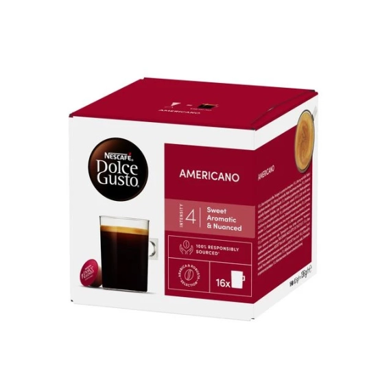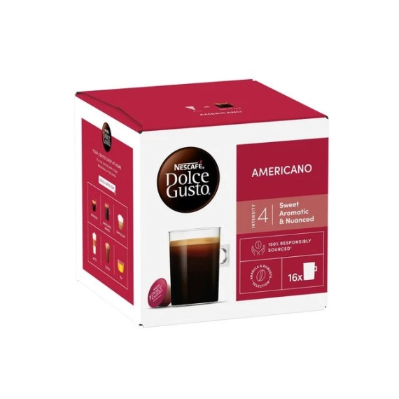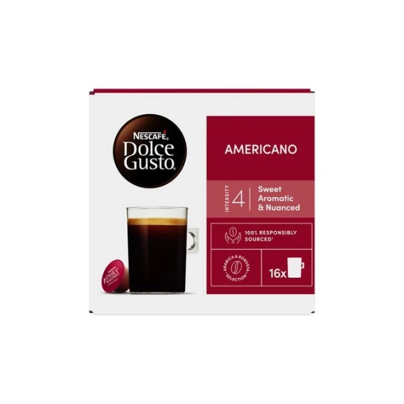 NESCAFÉ® Dolce Gusto® Americano - en 100% Arabica-kaffe med en intensitet på 4 av 11. Den store koppen på 230 ml inneholder en elegant kaffe med noter av frukt og blomster, har lett fylde og en fin crema. En blanding Arabica-bønner fra Sør-Amerika og Øst-Afrika skaper den delikate og milde smaken til NESCAFÉ® Dolce Gusto® Americano. - Nettovekt: 136g - Passer til NESCAFÉ® Dolce Gusto® kaffemaskiner - Inneholder 16 kapsler