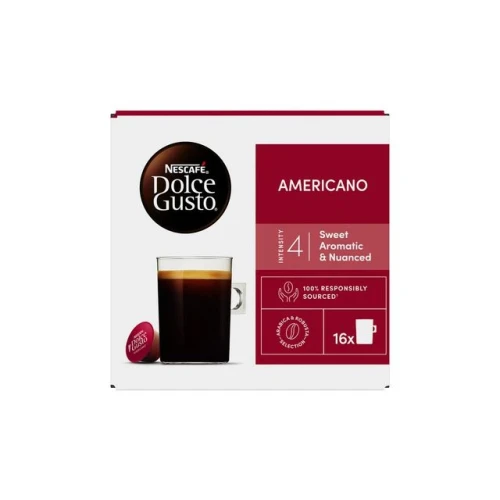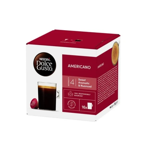 NESCAFÉ® Dolce Gusto® Americano - en 100% Arabica-kaffe med en intensitet på 4 av 11. Den store koppen på 230 ml inneholder en elegant kaffe med noter av frukt og blomster, har lett fylde og en fin crema. En blanding Arabica-bønner fra Sør-Amerika og Øst-Afrika skaper den delikate og milde smaken til NESCAFÉ® Dolce Gusto® Americano. - Nettovekt: 136g - Passer til NESCAFÉ® Dolce Gusto® kaffemaskiner - Inneholder 16 kapsler