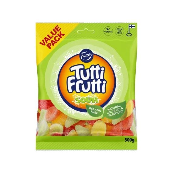 Tutti Frutti - gelegodteri med smak av frukt og bær, med en syrlig vri. En stor pose med Tutti Frutti-godteri med et syrlig belegg. Tutti Frutti Sour vil kile smaksløkene dine med bringebær, pære, sitron mm. Tutti Frutti er gelatinfritt og egnet for veganere. Naturlige fargestoffer. - Surt smågodt i pose - Allergener: Gluten (hvete) - Egnet for veganere