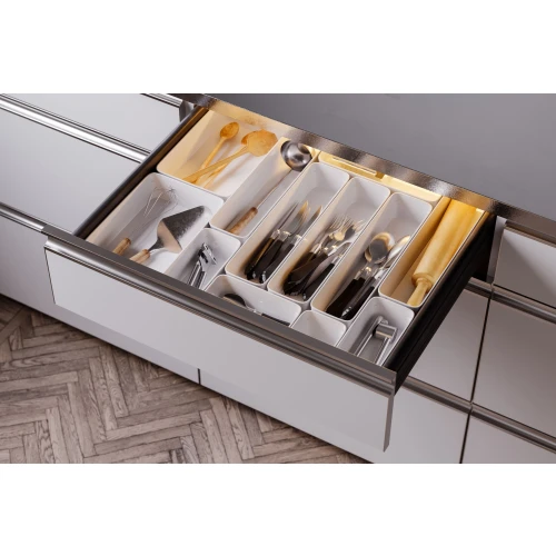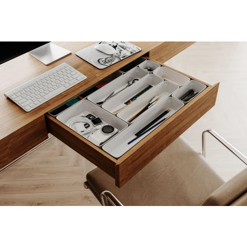 Fleksibel liten oppbevaring for organisering av skuffer og skap.