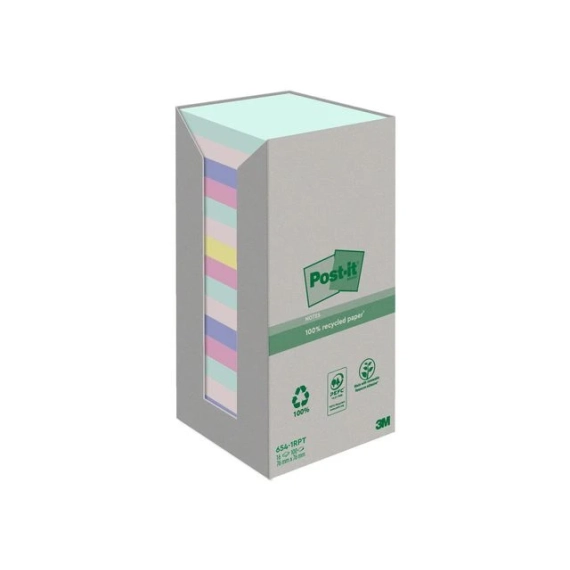 Post-it® Recycled Notes er laget av 100% resirkulert papir og et fornybart klebestoff, 60% laget av planter som vokser opp igjen årlig. De er sertifisert PEFC resirkulert, hentet fra sertifiserte, fornybare og ansvarlig styrte skoger.