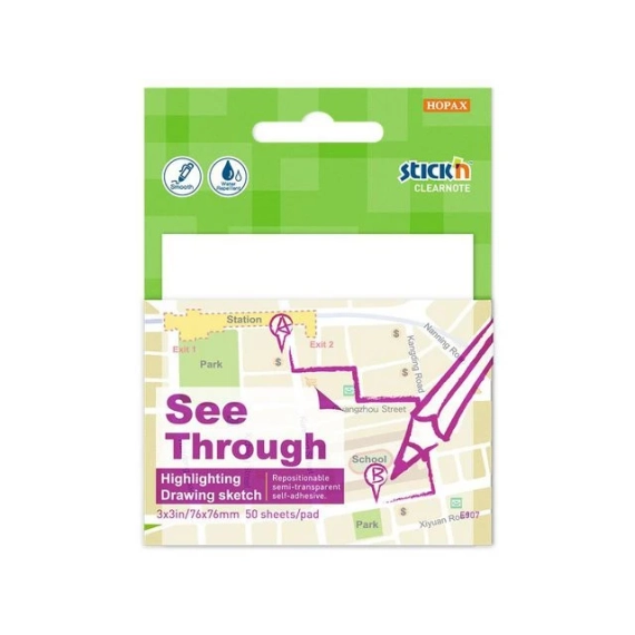 Clearnote Seethrough, hvite semi-transparente og selvklebende note-to-notes som fester seg overalt igjen og igjen uten å skade underlaget. Dekker ikke originaldokumentet under. Enkel å signere med de fleste vanlige skriveredskaper. Godt verktøy for å tegne, skissere og dekorere. - Mål: 76x76mm. - Antall ark: 50 stk.