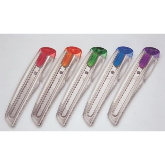 Kraftig kartongkniv med 18 mm blad og gjennomsiktig plasthåndtak og stålmekanisme. Utstyrt med automatisk lås og klips. Blader i skreddersydd japansk stål. Assorterte farger: blå, rød, grønn, gul og lilla.
